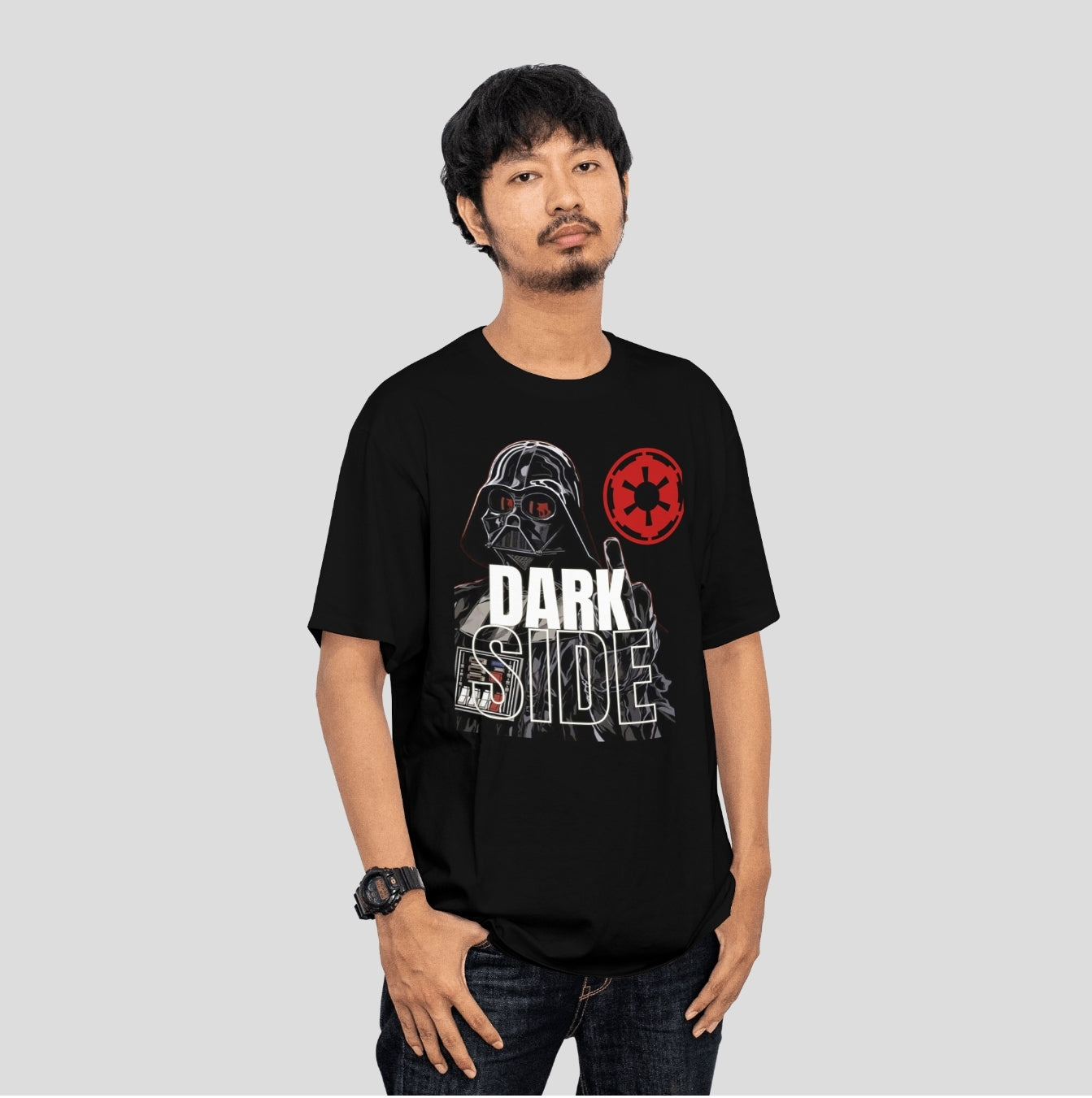 This custom shirt features a bold, high-contrast design of Darth Vader, his iconic helmet looming in a striking graphic style. Beneath him, the phrase "Dark Side" is printed in a sleek, futuristic font, emphasizing the power and mystery of the Sith. Perfect for Star Wars fans who embrace the allure of the dark side!