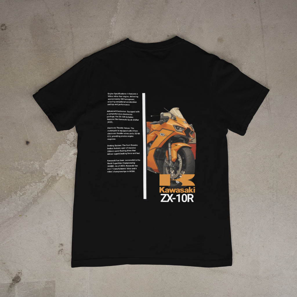 Fuel your passion for performance with our Kawasaki ZX-10R T-shirt. Featuring a sleek, detailed graphic of the iconic ZX-10R, this shirt is a tribute to the power, precision, and adrenaline of one of the world’s top sportbikes. Whether you’re a Kawasaki fan or a motorcycle enthusiast, this design showcases your love for speed and style. Crafted with soft, high-quality cotton, it offers comfort and durability, perfect for wearing on your next ride, at bike events, or while showing off your two-wheeled pride. Wear the thrill of the ZX-10R wherever you go!